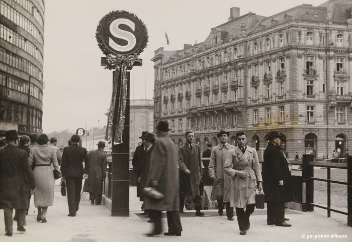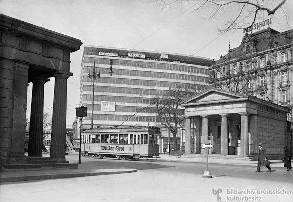 Interestingly, if you look at the very first photo I have posted – the one with the two women with cake tins on their heads in front of the U Bahn entrance – you will see a large building directly behind the entrance. That building -the Ritterschaftsdirektion -(and the U Bahn station itself, but not that entrance) still survives and can be seen on the Wilhelmplatz today. More detail on that building when I get around to the Wilhelmplatz.