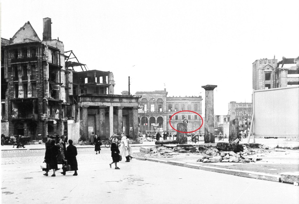 Not very clear but the red line in the photo on the left shows the placement of the “hump”, i.e. Hitler’s bunker, and the distance to Voss-Strasse. The red circle in this Google Earth photo shows the same placement and distance.