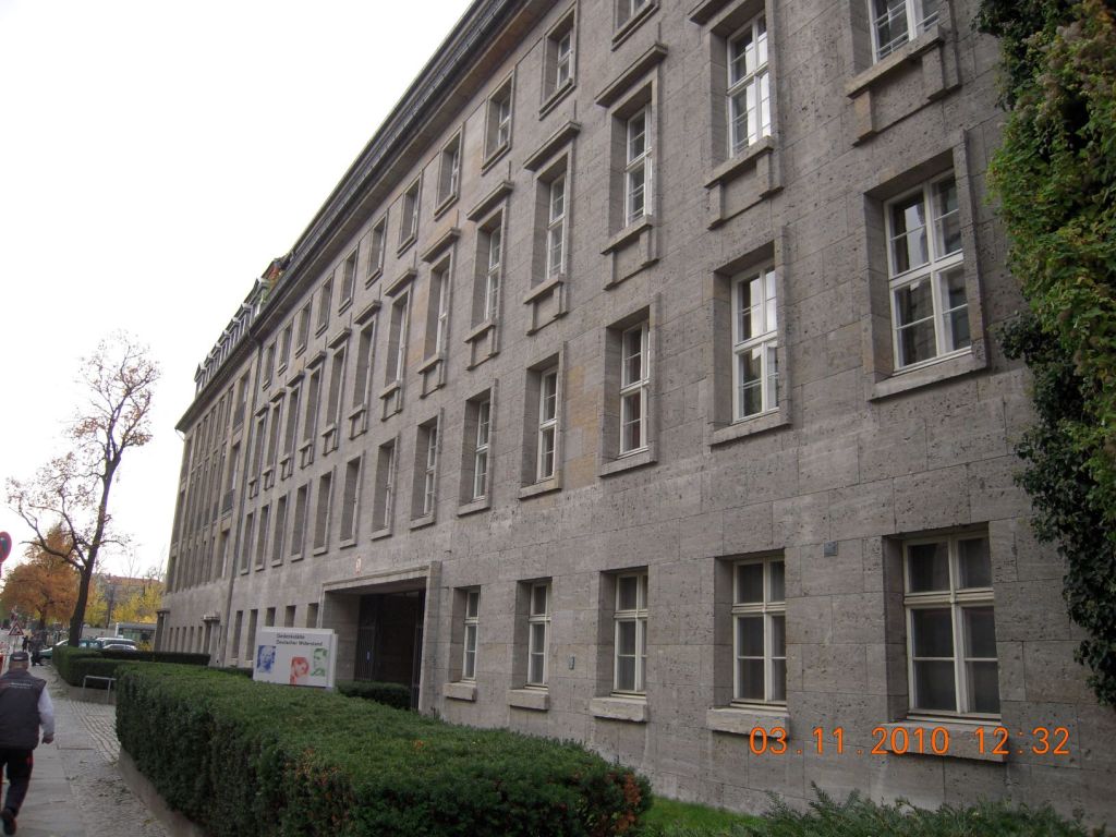 Because the Communists did not do a great deal of rebuilding you can still find old buildings from before the Second World War but you will need to hurry – because the Wall has come down a lot of these places are disappearing. A case in point is the corner of Wilhelmstrasse and Voss-Strasse. This corner originally (i.e. pre-war) was the site of the Reichs-verkehrsministerium (Reich Traffic Ministry). It can be seen in its heyday in the centre of this photo (red arrow), the Finance ministry is to the left of the photo (blue arrow), the Air Ministry (still standing in pretty much its original form) (orange arrow) can be seen further down the street and the Borsig Palais (green arrow) to the right: